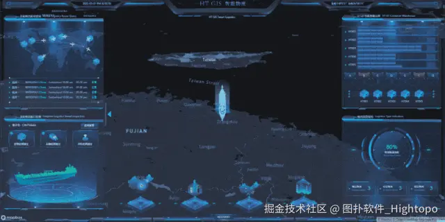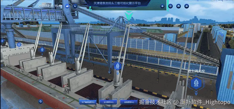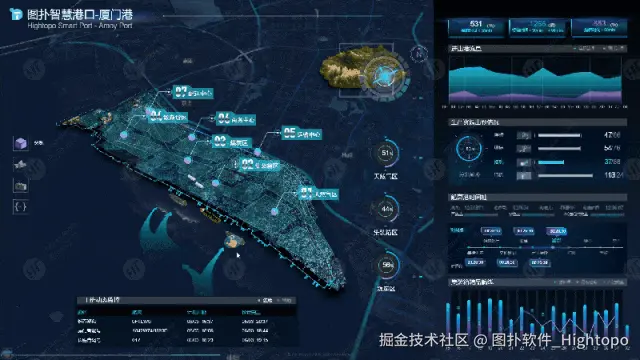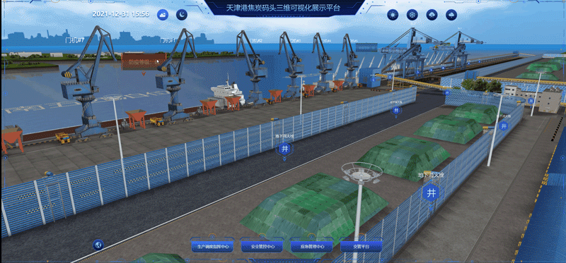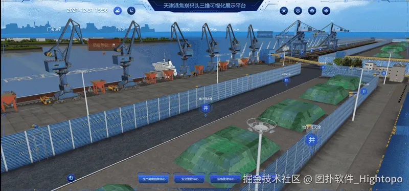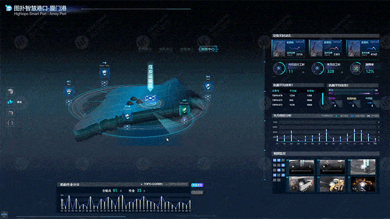 图扑软件凭借自主研发的 HT 技术,以厦门港为蓝本,深度融合物联网、大数据分析、人工智能算法等前沿技术,实现了对货物从存储、周转到配送全流程的智能化管控。在 3D 可视化场景中,完整呈现港口功能区域布局,包括配送中心、散货杂区、煤炭区、运输中心、集装箱区和天然气区。