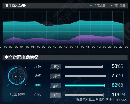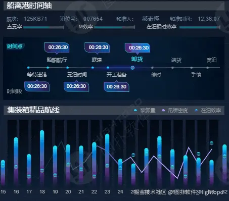 利用 HT 丰富的可视化仪表盘,系统实时呈现泊位利用率、装卸效率、船舶周转时间等港口运输关键指标,帮助管理人员及时掌握生产动态,优化运输调度决策。同时,集成 2D 平面图和 3D 场景展示,直观呈现港区设施布局和作业状态,为港口运输管理提供精准的数据支撑。