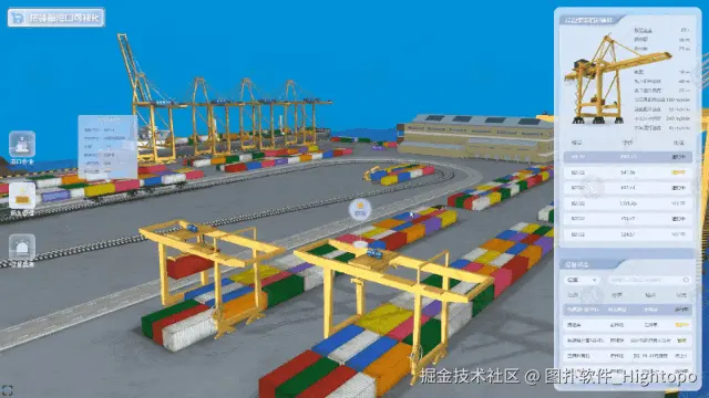 图扑软件与天津港焦炭码头联合开发的智慧码头解决方案,集成安全预警、生产调度指挥等精细化管控系统。借助图扑 HT 数字孪生系统,码头管理人员能够实时掌握门机、岸桥、堆场龙门吊和输送机等各类关键设备的运行状态,包括转速、载重、位移等核心参数,及时发现并预测潜在的设备故障。