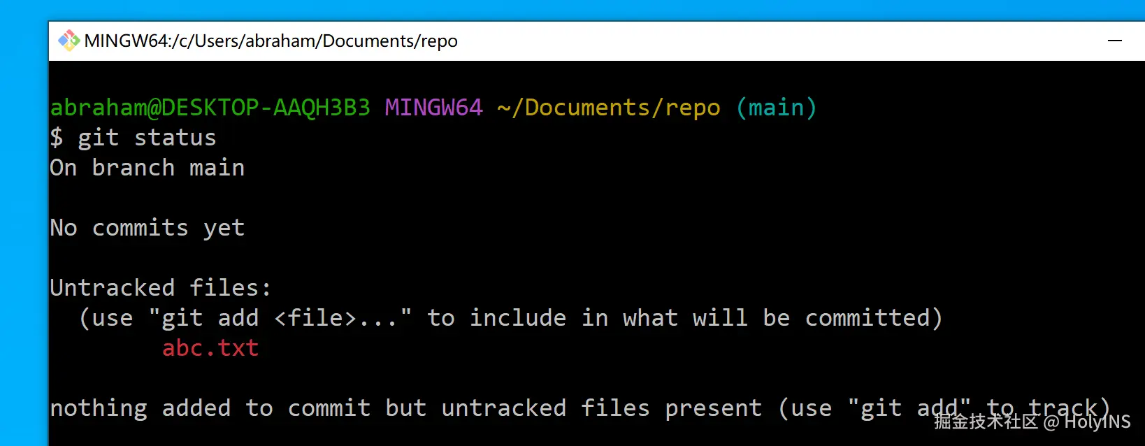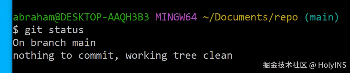 在完成 add + commit 的丝滑小连招以后我们再来 status 查看一下我们当前 git 仓库的状态。