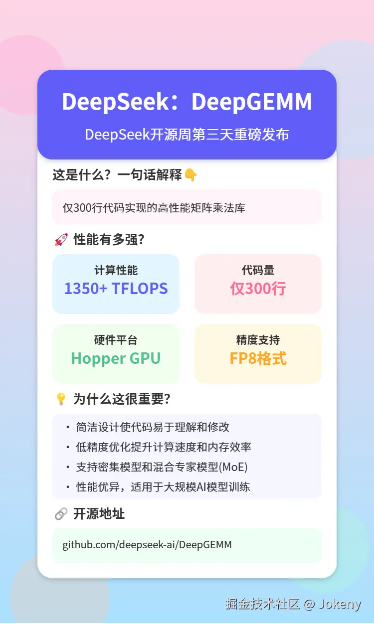🌐 开源地址:[GitHub - deepseek-ai/DeepGEMM](https://github.com/deepseek-ai/DeepGEMM)