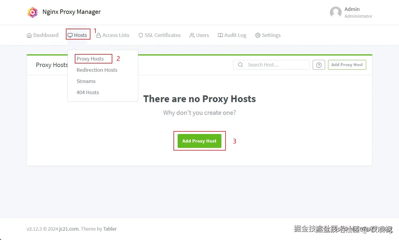 Hosts->Proxy Hosts->Add Proxy Host来添加代理主机;