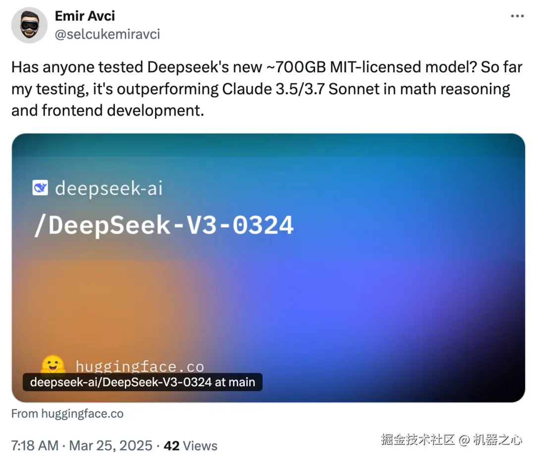 有人表示,经过自己的测试,DeepSeek-V3-0324 在数学推理和前端开发方面的表现优于 Claude 3.5 和 Claude 3.7 Sonnet。
