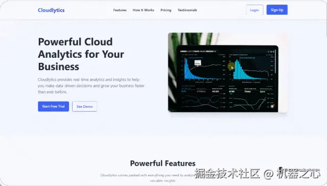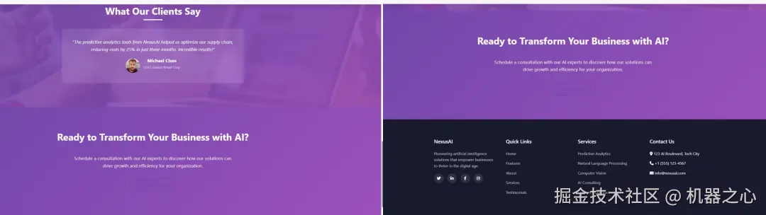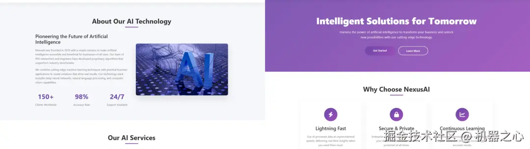 提示词如下:为 AI 公司「NexusAI」创建一个外观精美的响应式首页,将所有内容包含在一个 HTML5 文件中。结果如下图所示,所有图像,包括用户故事和他们的面孔,一切都是用这个提示完成的。