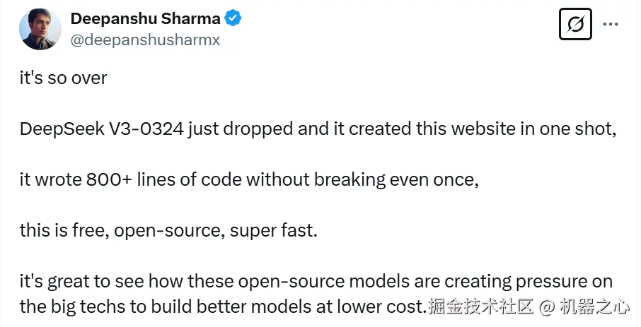 模型放出来后,DeepSeek-V3-0324 的代码能力让所有人震惊了!