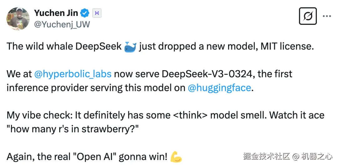 Hyperbolic 联合创始人兼 CTO Yuchen 称自己的氛围测试显示,DeepSeek- V3-0324 已经有了一些思维链模型的影子。
