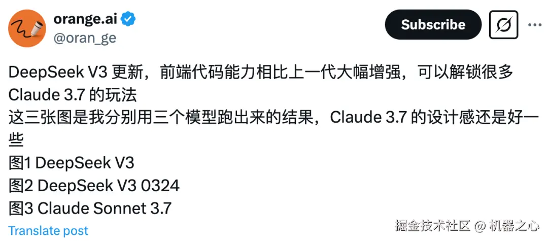 X 博主「orange.ai」对 DeepSeek V3、DeepSeek-V3-0324 与 Claude Sonnet 3.7 的海报设计结果进行了比较,同样表示前端代码能力相比上代有了显著增强。