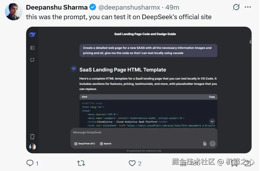 他认为:DeepSeek-V3-0324 是 DeepSeek 最好的非推理模型,通常更适合创意写作任务,但现在也比 R1 更适合制作 HTML5 + CSS + 前端。上述提示的结果代码总共 958 行,但它实际上实现了一个交互式网站,包括所有图像。并且结果也适用于移动设备。