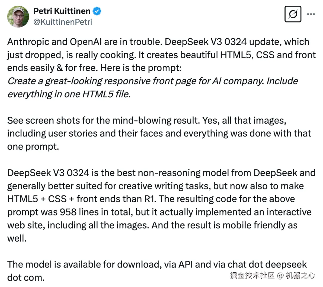 X 博主「@KuittinenPetri」表示,Anthropic 和 OpenAI 陷入了困境。更新后的 DeepSeek-V3-0324 可以轻松免费地创建漂亮的 HTML5、CSS 和前端。