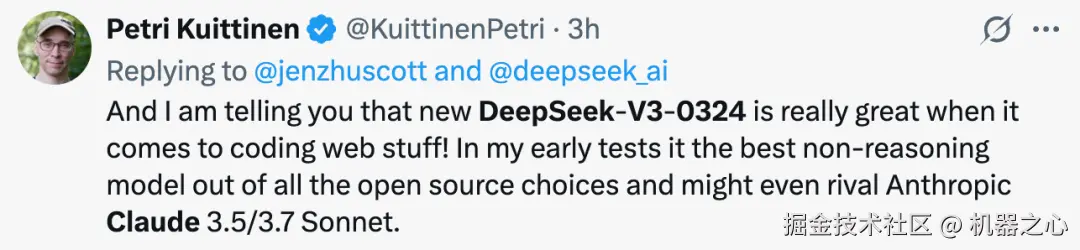 他还称,DeepSeek-V3-0324 在编写代码方面确实很棒!早期测试显示,它是所有开源选择中最好的非推理模型,甚至可以与 Claude 3.5/3.7 Sonnet 相媲美。
