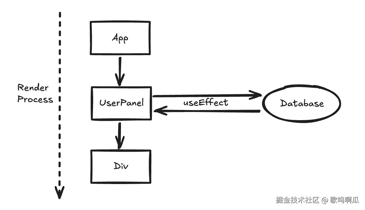 - useEffect 与数据库交互,完成副作用,更新 state 并触发第二次渲染;