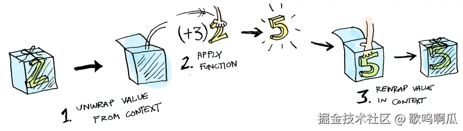 而 Monad 则定义了另一种不同的方法。它将一种特殊形式的函数应用到封装的对象上,它的入参为普通的对象而返回值为一个封装到上下文中的对象: