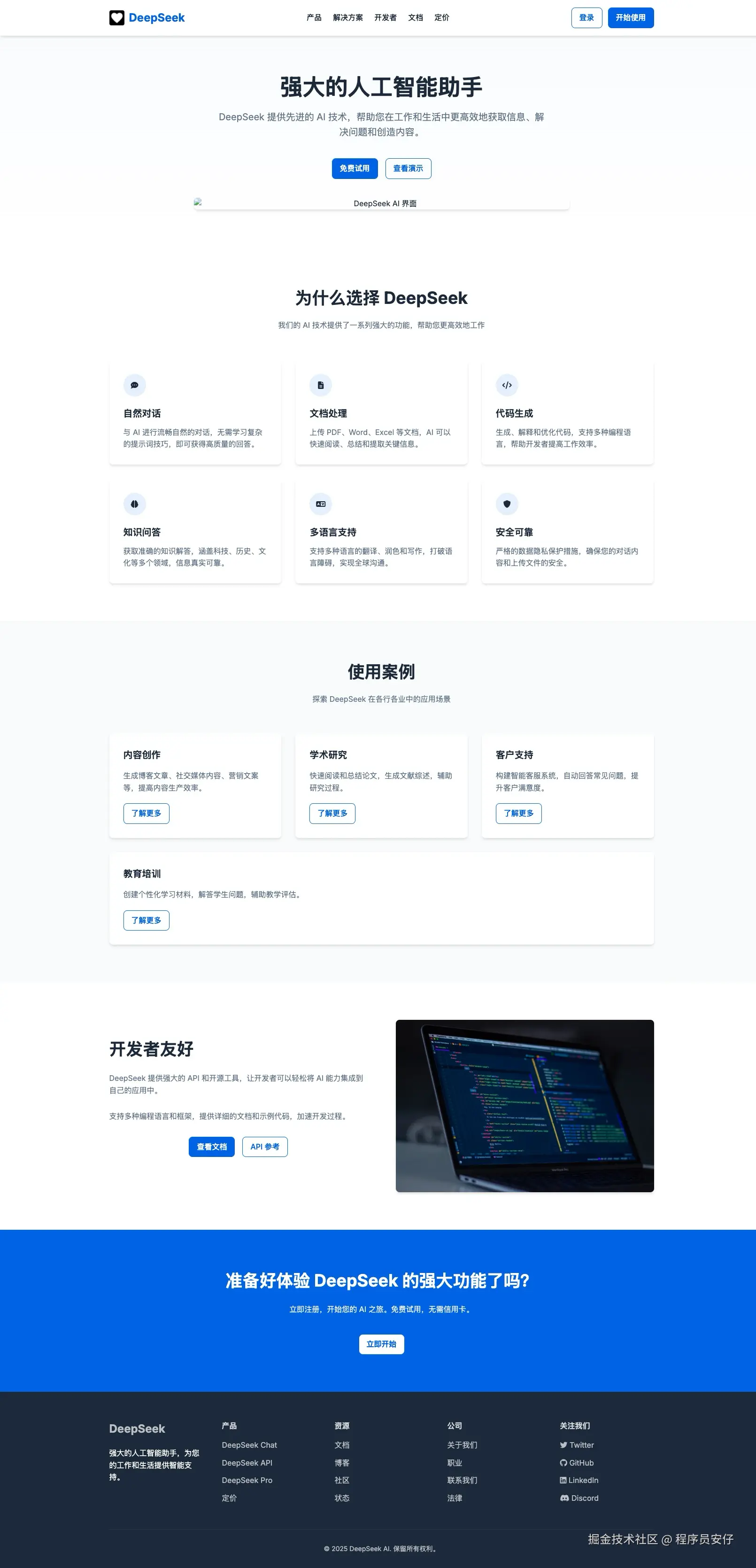 帮我参考网站:https://deepseek.ai/ 的网页风格和元素做一个类似的网页出来,返回给我完整的 HTML 页面。