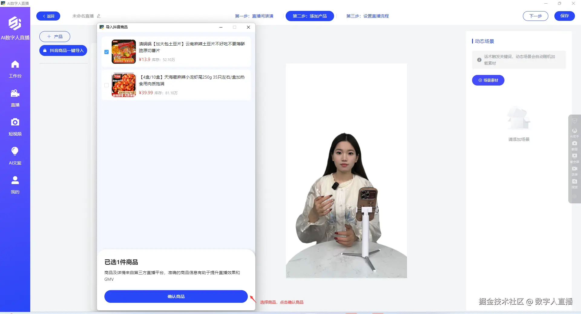 登录抖音之后,选择导入抖音的商品,点击确认商品,即可自动生成商品的直播话术 。