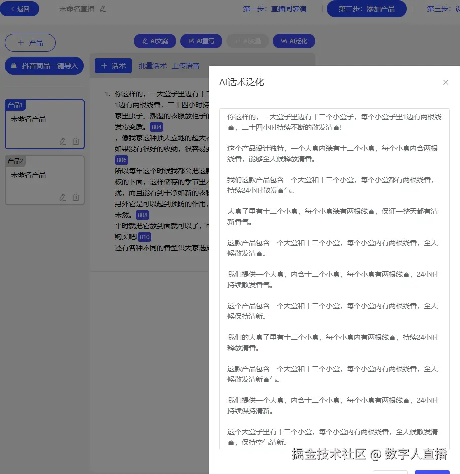 ●青否数字人直播系统话术直播商品一键导入---大模型帮您写话术,以及帮您生成话术变量保障直播间更稳定!