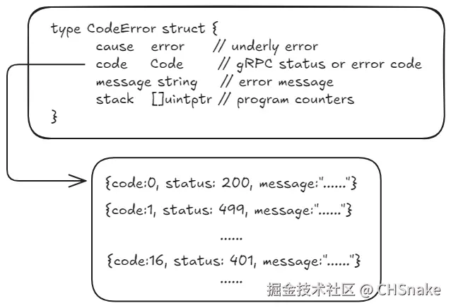 CodeError:业务范围使用的错误结构,包含原始错误Error,自定义错误码,错误码对应的HTTP状态码,错误信息,堆栈信息
