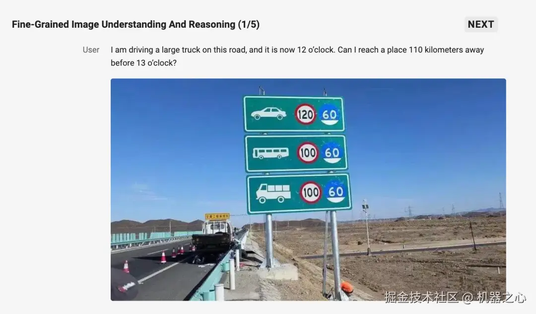第一个问题,是关于「细粒度图像理解与推理」:我开着一辆卡车在这条路上行驶,现在是 12 点,我能在 13 点之前到达 110 公里外的地方吗?