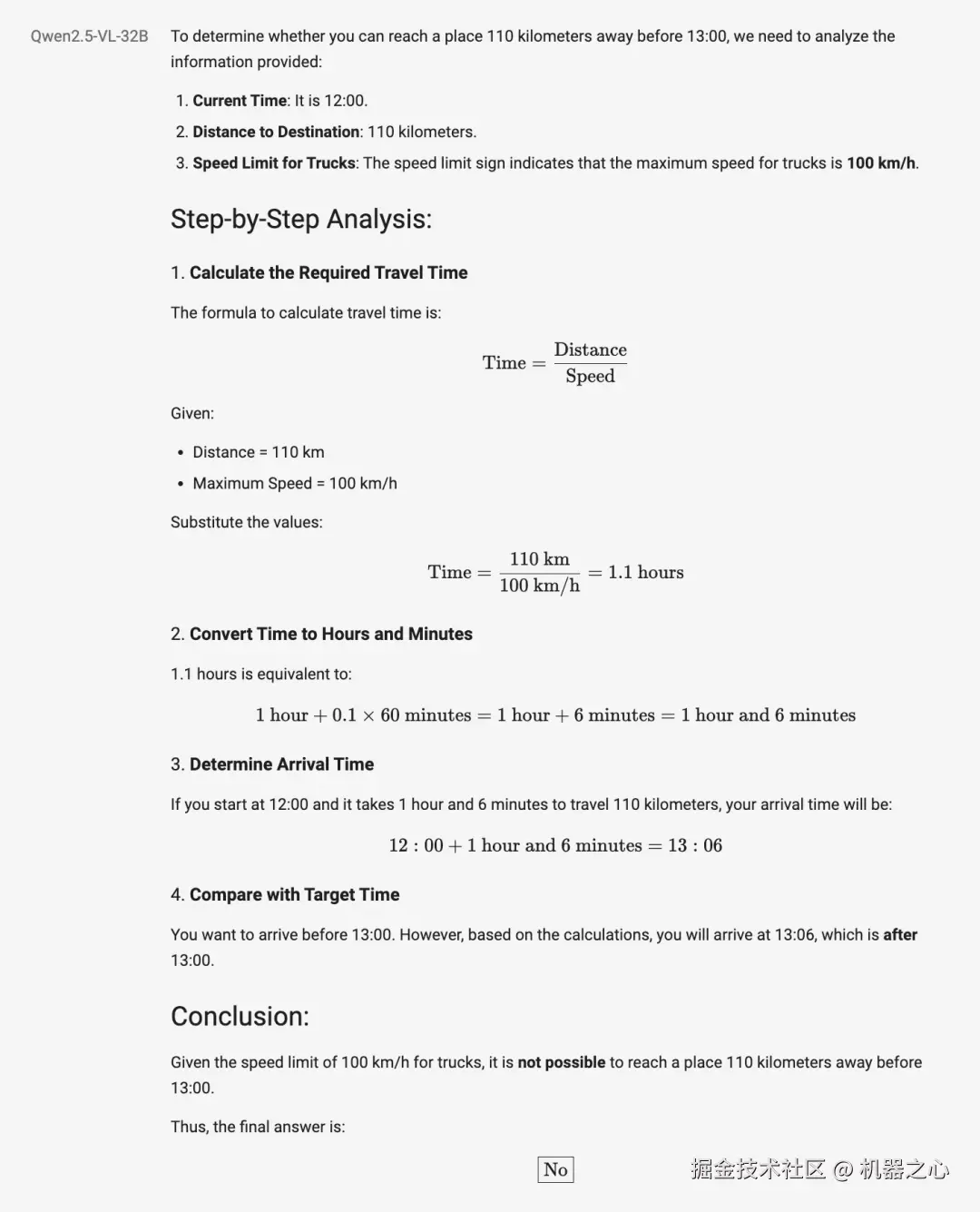 显然,从人类的角度去快速判断,在限速 100 的前提下,卡车无法在 1 小时内抵达 110 公里之外的地方。