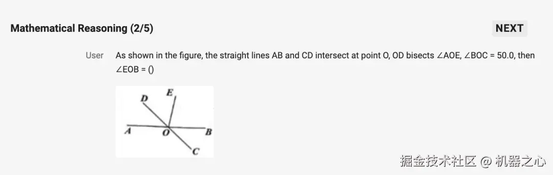第二个问题是「数学推理」:如图,直线 AB、CD 交于点 O,OD 平分∠AOE,∠BOC=50.0,则∠EOB=()