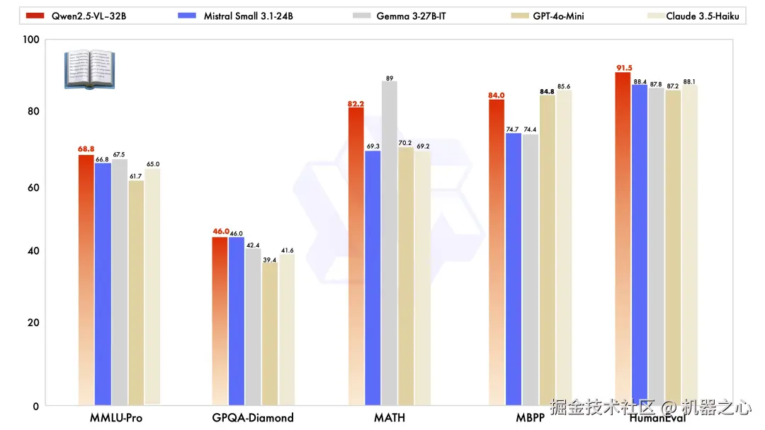 除了在视觉能力上优秀,Qwen2.5-VL-32B-Instruct 在纯文本能力上也达到了同规模的最优表现。