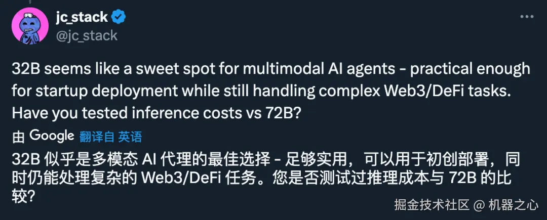 32B 版本的出现,解决了「72B 对 VLM 来说太大」和「7B 不够强大」的问题。如这位网友所说,32B 可能是多模态 AI Agent 部署实践中的最佳选择: