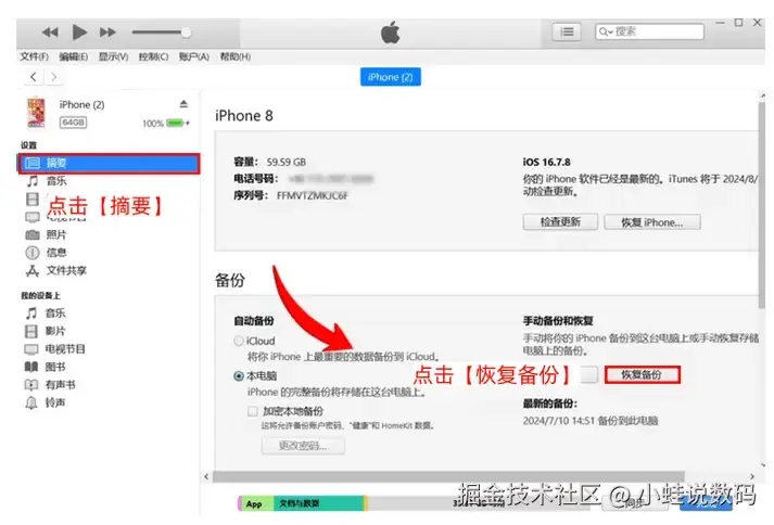 苹果删掉的视频怎么恢复?在电脑上的iTunes备份过的话,还可以试试这招。恢复过程可能需要一些时间,具体取决于备份的大小和恢复的文件数量。