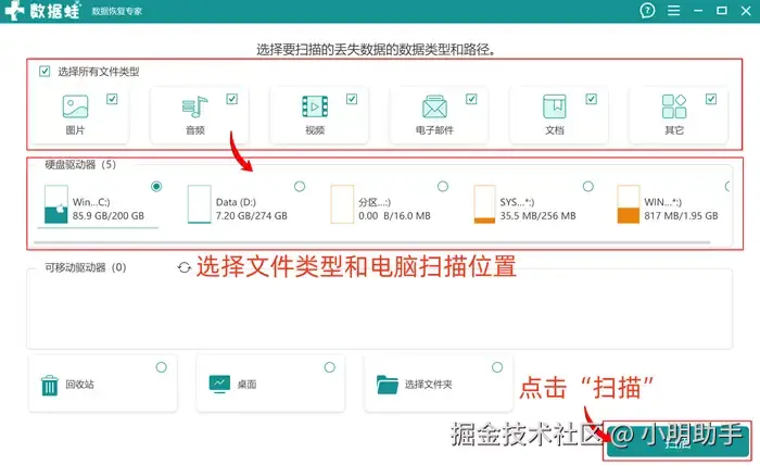 步骤1:在这款软件的首页,用户可以根据自己的实际情况选择需要恢复的文件类型和需要扫描的电脑位置(即文件丢失的原位置,不是回收站),点击“扫描”;