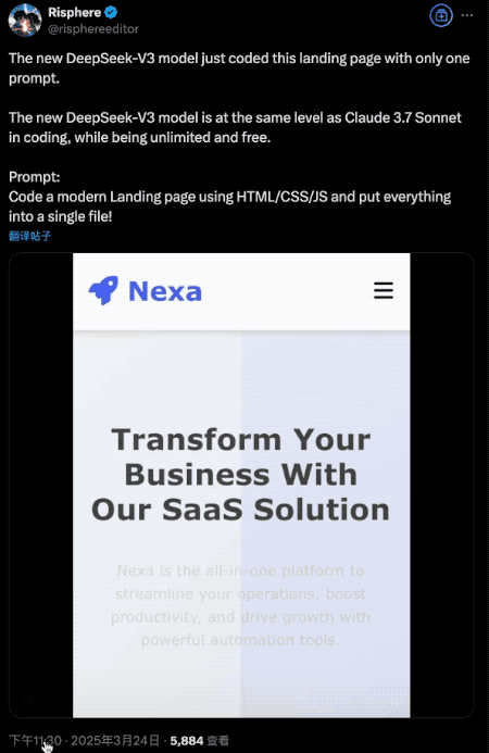 编程这块,只需一句提示词开发一个完整产品着陆页,带自适应布局带动效,被评价为与 Claude 3.7 Sonnet 同一水平。