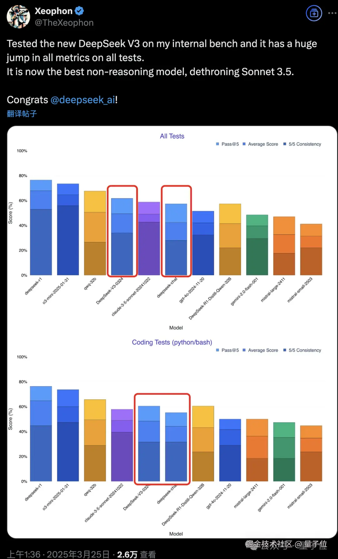 由于发布时间太短,还没有正式测评结果,不过在开发者 Xeophon 的个人 Benchmark 上所有指标都有大提升,成为该测试下最好的非推理模型。