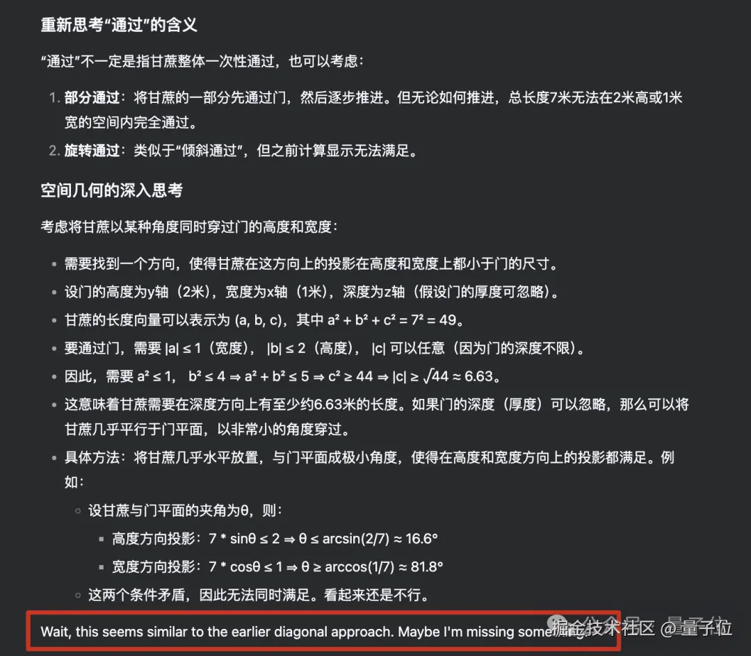碰壁之后开始重新思考题目本身的含义,后面依旧陷入误区,但突然在中文解题过程中夹杂一句英语思考,类似 DeepSeek-R1 技术报告中的 “啊哈时刻”。