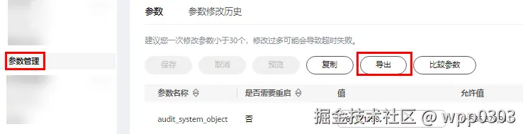 在左侧导航栏中选择“参数管理”,在“参数”页签单击“导出”。