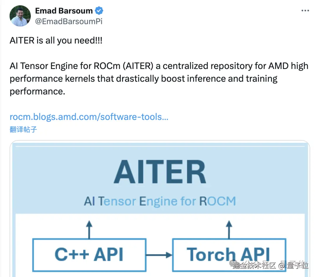 AITER 可以用来加速 GPU 训练和推理,AMD 副总裁 Emad Barsoum 直接喊出了 AITER is all you need。