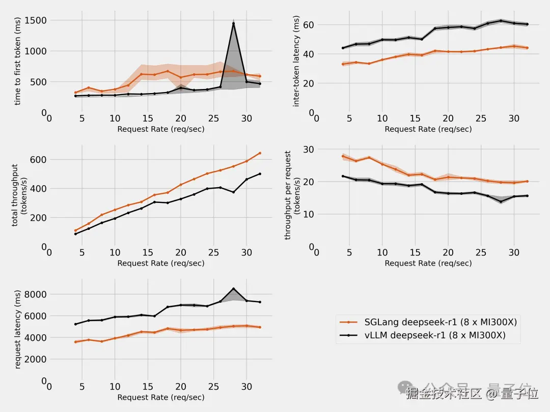 前面提到的第三方,也在 MI300X 上分别用 SGLang 和 vLLM 进行了测试,结果 SGLang 完胜。