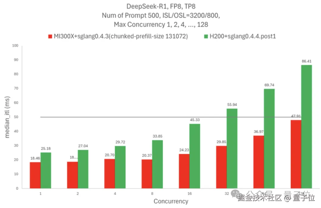 如果需要 Token 间延迟不超过 50 毫秒,一个 H200 节点可以处理 16 个并发请求,MI300X 节点则可以处理 128 个。