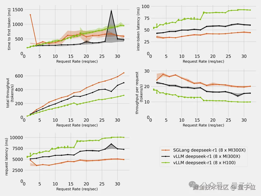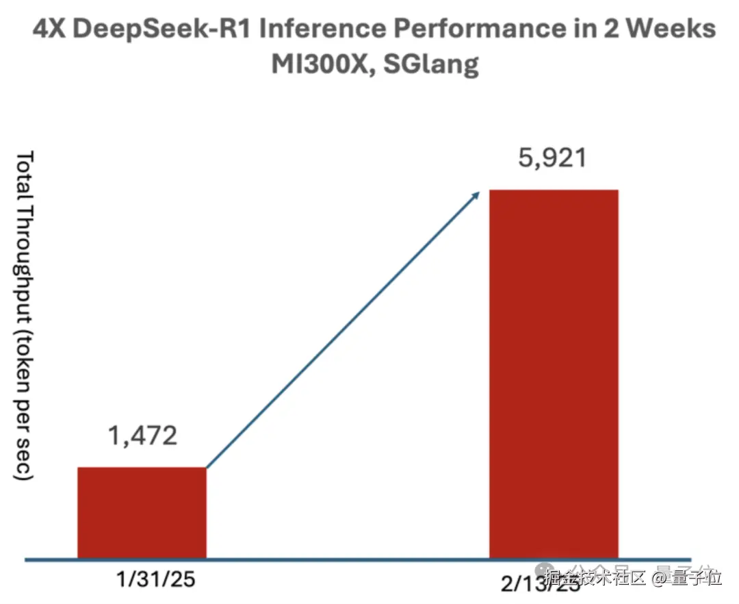 在稍早一些的测试当中,使用 SGLang 在 MI300X 上运行 DeepSeek-R1,仅过了两周就相比于 day 0 时性能提升到了 4 倍,吞吐量达到了每秒 5921 Tokens。