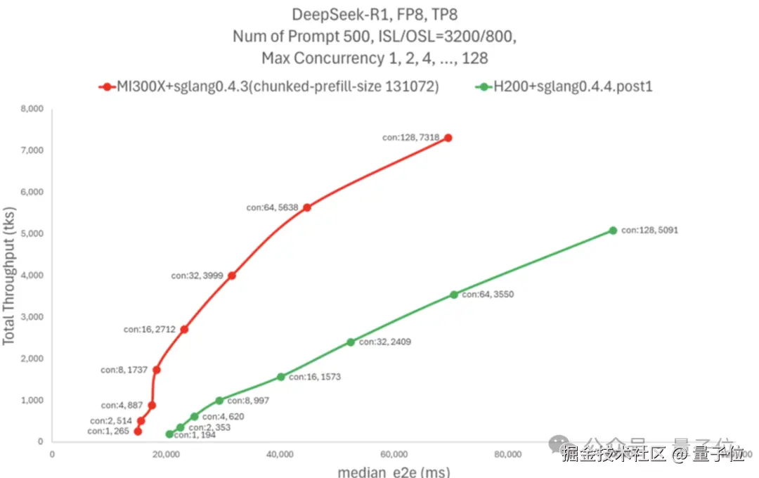 AMD 的测试结果显示,MI300X 在延迟相似的情况下实现了 H200 五倍的吞吐量,超过了每秒 7k Tokens。