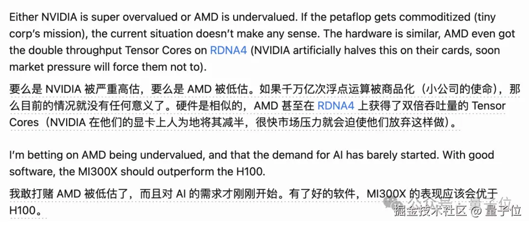 之前著名黑客 George Hotz 也曾表示自己非常看好 AMD,认为只要有好的软件 MI300X 表现就能超越 H100。