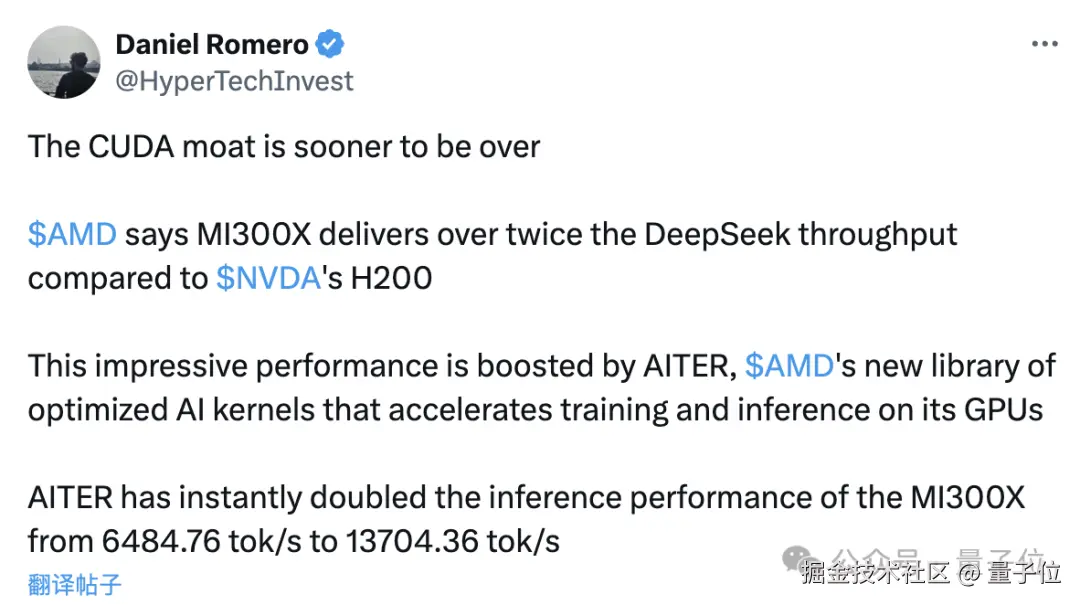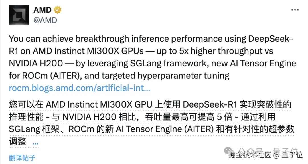 而在硬件层面,MI300X 高效运行 R1 的关键,是 AMD 为 ROCm(可以理解为 AMD 版 CUDA)打造的 AI 张量引擎 AITER。