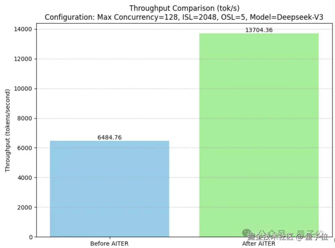 开启 AITER 后,MI300X 上 DeepSeek-V3 的吞吐量是开启前的两倍多。