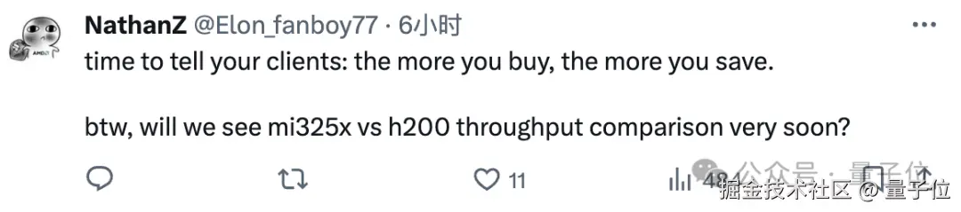 看到 MI300X 的表现,有人拿出了老黄经典的那句 “买的越多省的越多”,表示现在这句话该让 AMD 来说了。