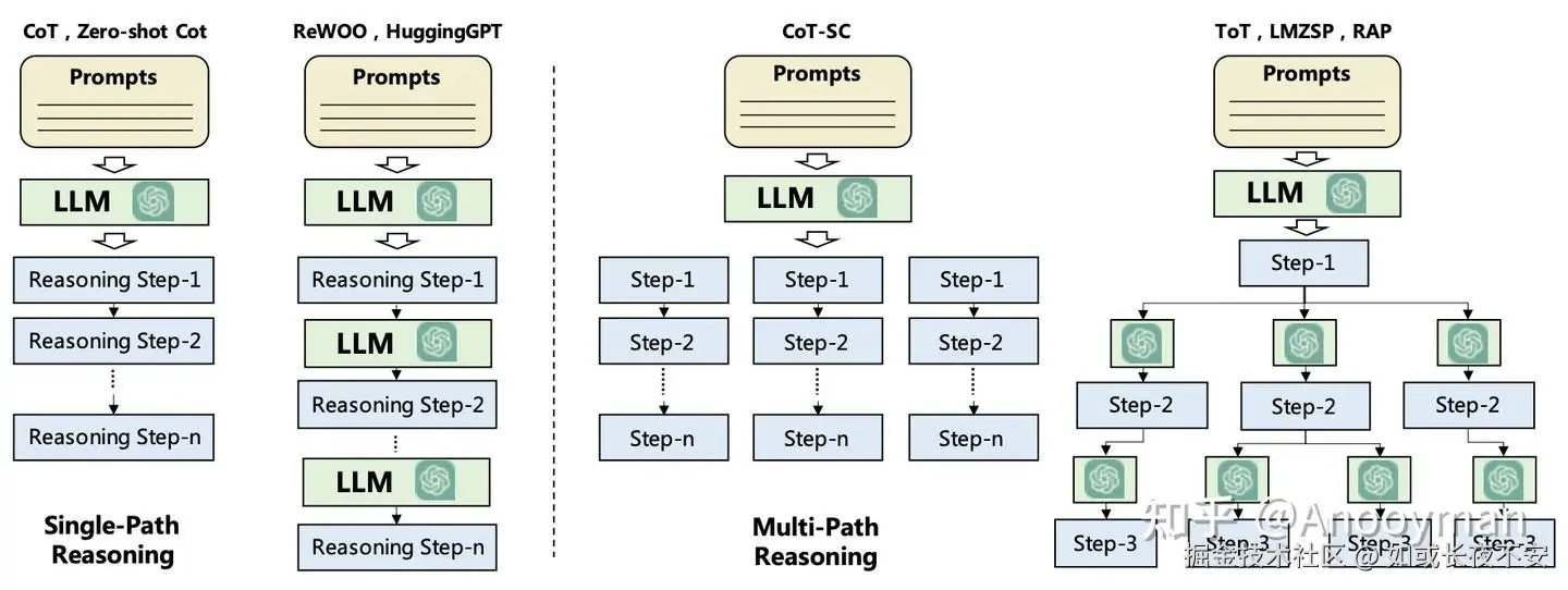任何一个大语言模型都具备一定的规划能力。当与 Agent 的其他模块相结合时,便能进一步提升整个任务的完成度。简单来说,当 LLM 没有其他模块辅助时,只能进行一些简单的规划推理,例如 Cot、Tot、Got、ReWOO 等,这种情况被称为无反馈规划,即 LLM 制定规划后,不会得到外部反馈就直接生成结果。包含单路径推理、多路径推理等方法