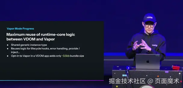 在虚拟 DOM 模式和 Vapor 模式里最大程度的复用了 runtime-core 的代码以减少两者共存时的代码体积:
