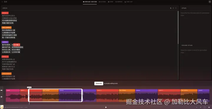 虽然Suno还是有很多小的问题,但是更新提供直接编辑音乐的功能之后,Suno的可用性已经大大提高,生成的音乐可以通过编辑而不是反复抽奖来完善作品,相较而言更容易制作出一首精品歌曲。