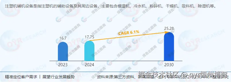 根据QYResearch最新调研报告显示,2023年全球注塑机辅机设备市场销售额达到了16.7亿美元,预计2030年将达到25.28亿美元,年复合增长率(CAGR)为6.1%(2024-2030)。这表明全球注塑机辅机设备市场将持续保持稳定增长态势。