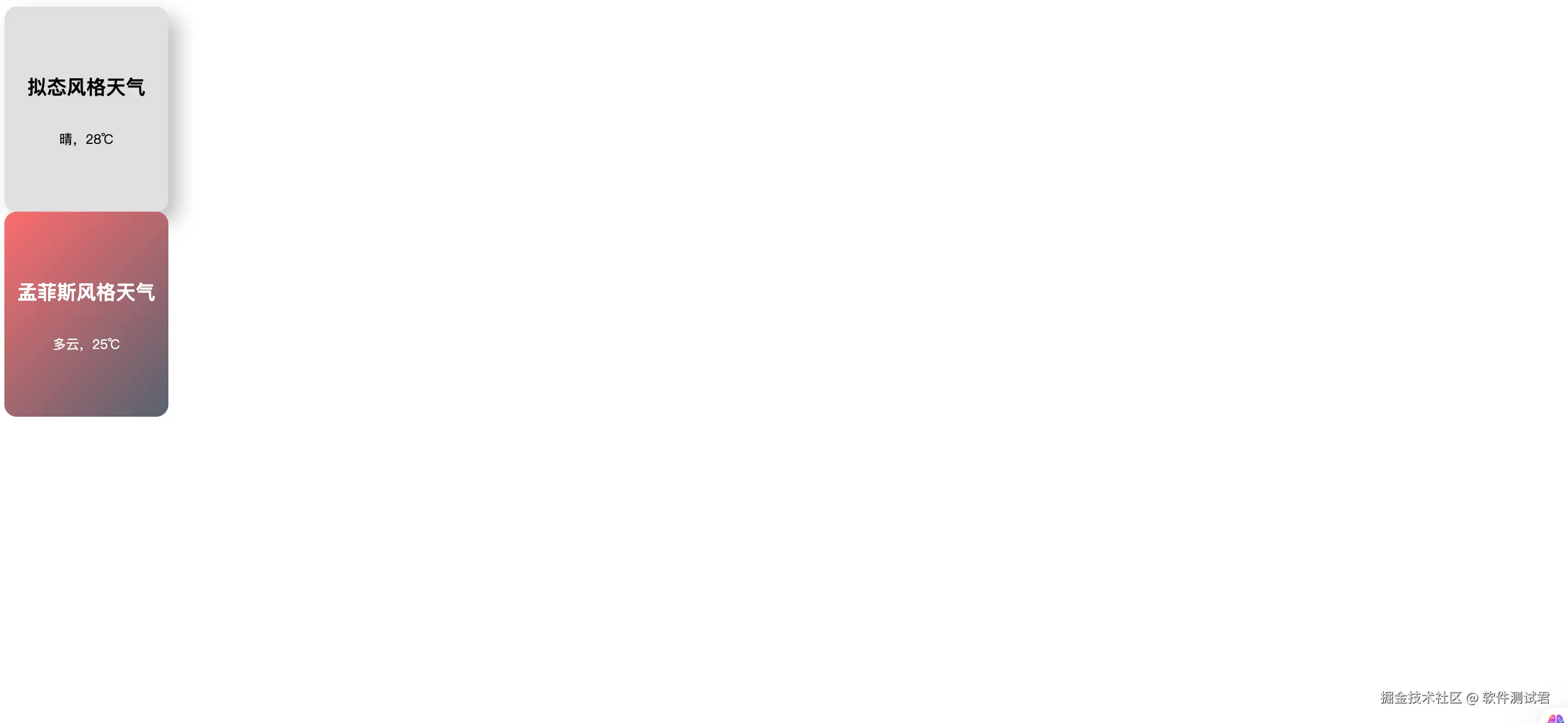 以往,除了Doubao-1.5-pro,其他模型的UI审美都不太在线。我就给它们出了两道题,分别是“帮我写一个拟态风格的天气卡片”和“帮我写一个孟菲斯风格的天气卡片”。