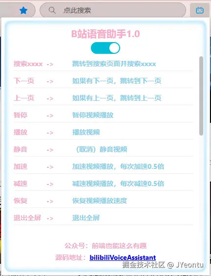 最近在b站刷视频的时候,有时候懒得动手去点鼠标,所以就想着搞了个插件,可以解放双手,直接通过语音来操作页面控制视频播放。