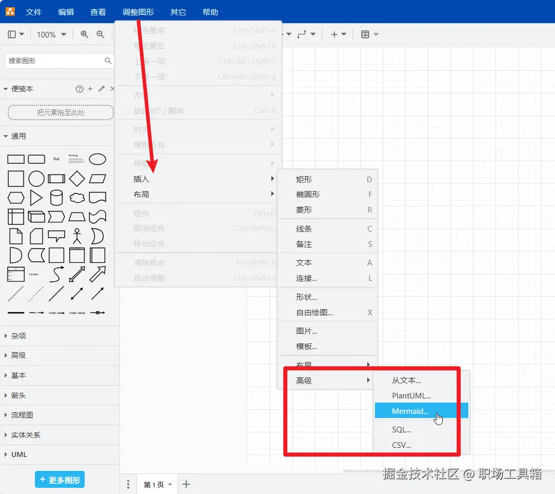 点击drawio顶部的调整图形选项卡,依次选择“插入 > 高级 > Mermaid”,打开Mermaid输入框,删除默认的Mermaid代码,粘贴刚由DeepSeek生成的Mermaid代码。