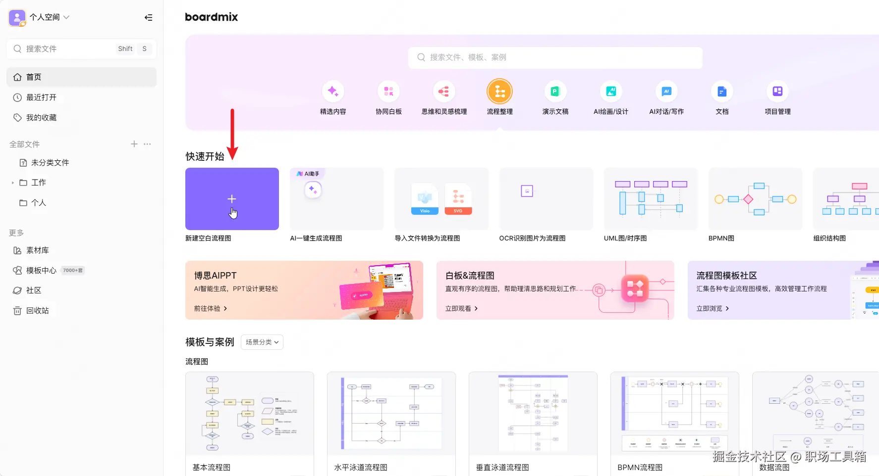 单击boardmix工作台的“新建空白流程图”,创建一个boardmix文件。