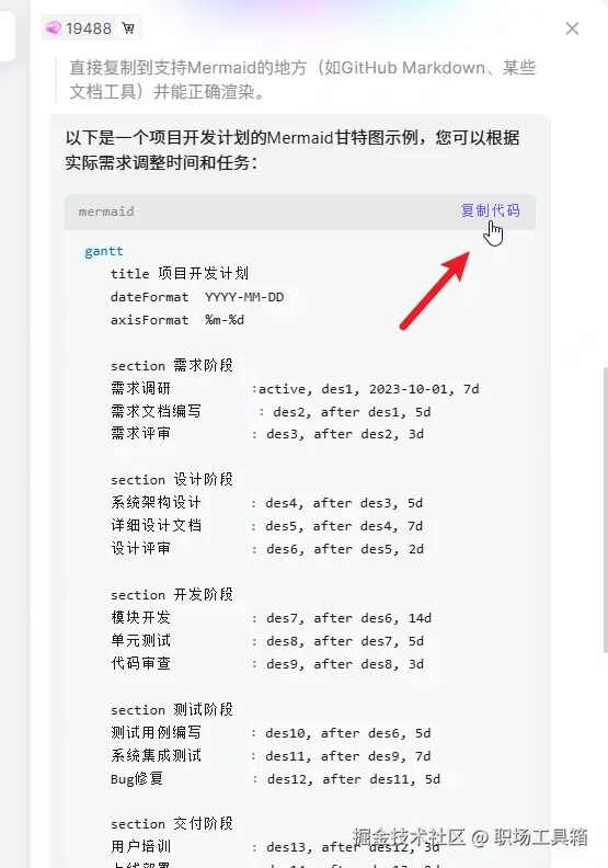 得到Mermaid表示的甘特图代码,点击右上角的按钮,复制Mermaid代码。