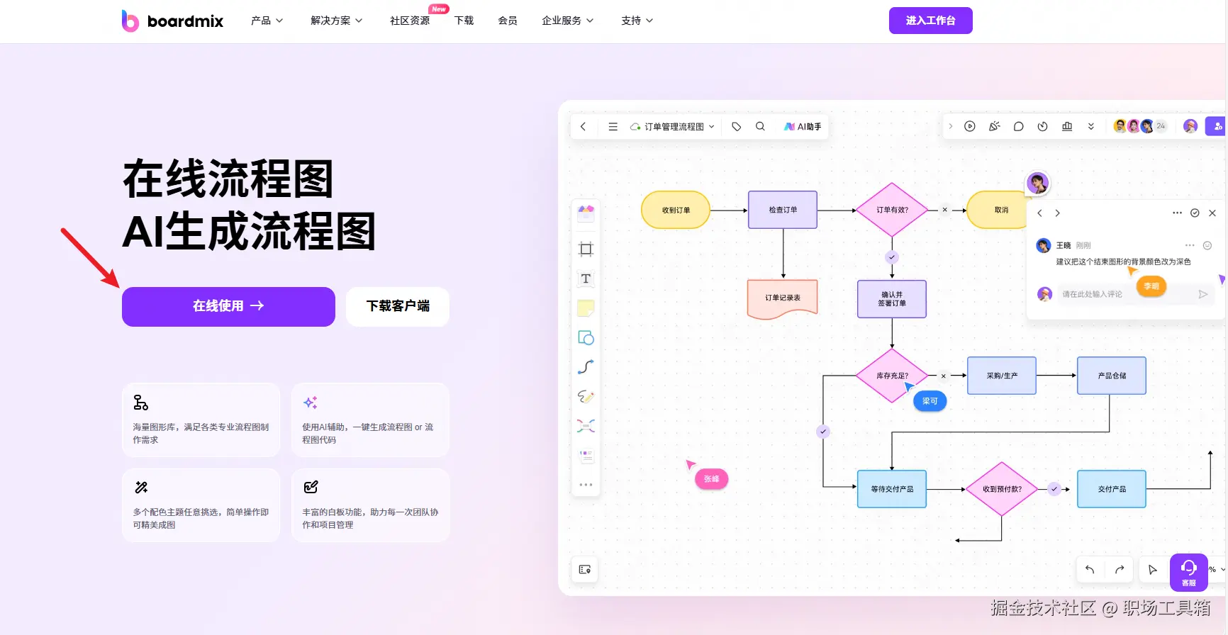 在浏览器打开boardmix首页,点击左侧的“在线使用”,进入boardmix工作台。
